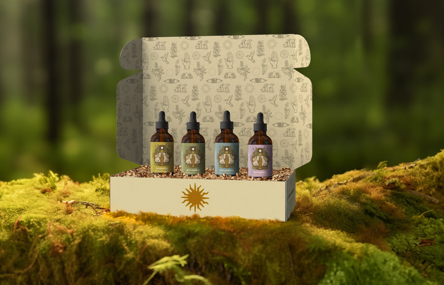 The Journey Collection includes four tinctures—Centering, Grounding, Integrating, and Sustaining—each crafted to support a core phase of your journey, from setting powerful intentions to grounding and integrating transformative experiences.